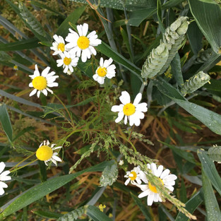 Sunday 7th - The temperature has dropped a bit the past few days but I welcome it. A few clouds now dotted in the blue sky and there is a cool breeze. I’ve spent the past few days identifying grasses and wild flowers – all familiar to look at but nameless. It’s been quite fun and interesting to do. Even those that we call ‘weeds’ - they all have a name. It’s very soothing to wander amongst the many shades of green – everything seems very tall – almost like each plant is clamouring for attention. Nettles, cow parsley and grasses taller than me! The wheat in the fields is growing fast but still very green and, in another field, barley sways in the summer breeze. Chamomile pokes its sunny face from between the stalks.